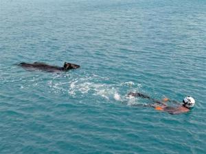 海上保安庁の潜水士、海を泳いでいた牛を救助 沖縄・宮古島(12pt)